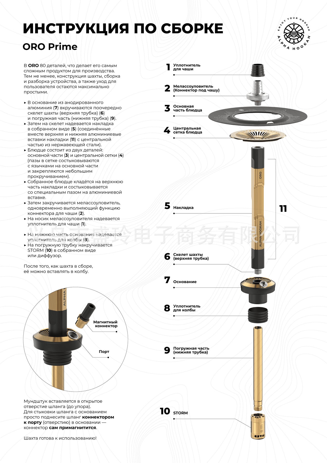 Materials: Stainless steel, anodized aluminum, polyacetal. Original blowout system. Height without bowl: 535 mm. Inner diameter: 13-14 mm. Removable diffuser. Country of origin: Russia (Saint Petersburg). Color: Gold, Matte black. Package contents (fully assembled): Without glass bowl. Smoke stem. Seal for glass bowl. Coal tray. Mouthpiece. Silicone hose (matte). Diffuser. Replacement sealing rings.Materials: Stainless steel, anodized aluminum, polyacetal.Original blowout system.Height without bowl: 535 mm.Inner diameter: 13-14 mm.Removable diffuser.Country of origin: Russia (Saint Petersburg).Color: Gold, Matte black.