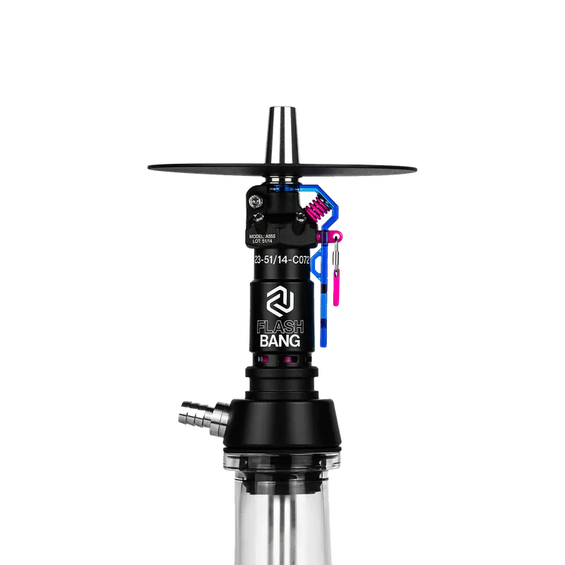 Unique blowoff system: The Flash Bang vents evenly vertically from the sleeve in the direction of the bowl. At the top of the sleeve four screws were installed so that the hookah is also vented in the direction of the plate.