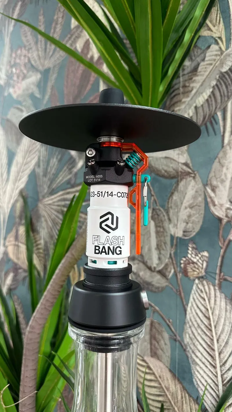 Unique blowoff system: The Flash Bang vents evenly vertically from the sleeve in the direction of the bowl. At the top of the sleeve four screws were installed so that the hookah is also vented in the direction of the plate.
